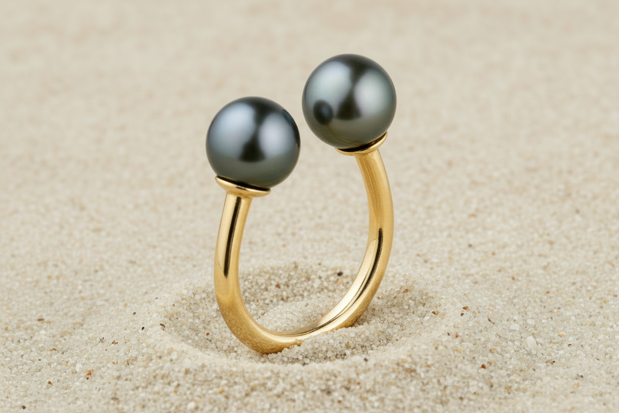 Deux perles de Tahiti de 10-11mm se font face, comme deux âmes liées, portées par un anneau en argent ou en OR délicatement ouvert qui évoque le dialogue, la liberté et l’équilibre. Élégante et symbolique, la bague TA’UA est une ode à l’amour, au lien et à la complémentarité. Un bijou précieux à offrir ou à s’offrir, comme un talisman moderne chargé d’émotion.