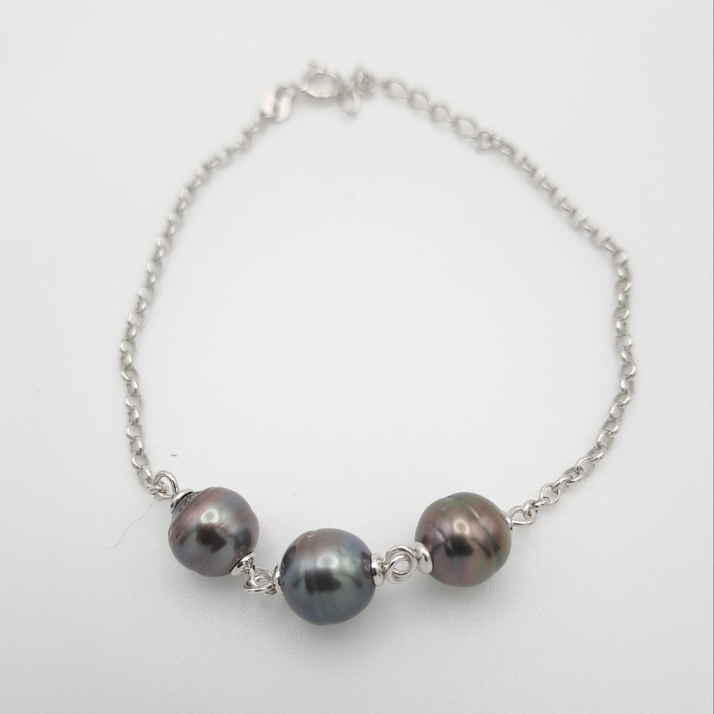 Bracelet en Argent et 3 Perles de Tahiti Cerclées B/C