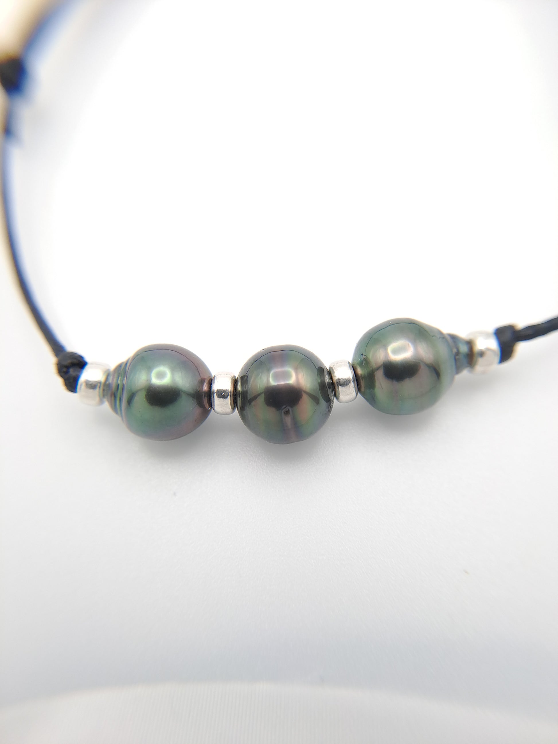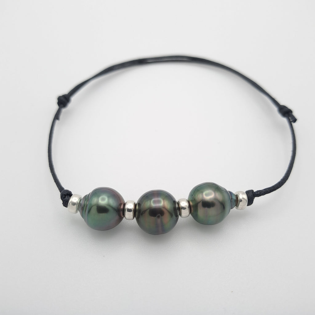 Bracelet en coton ciré et 3 Perles de Tahiti Cerclées B/C