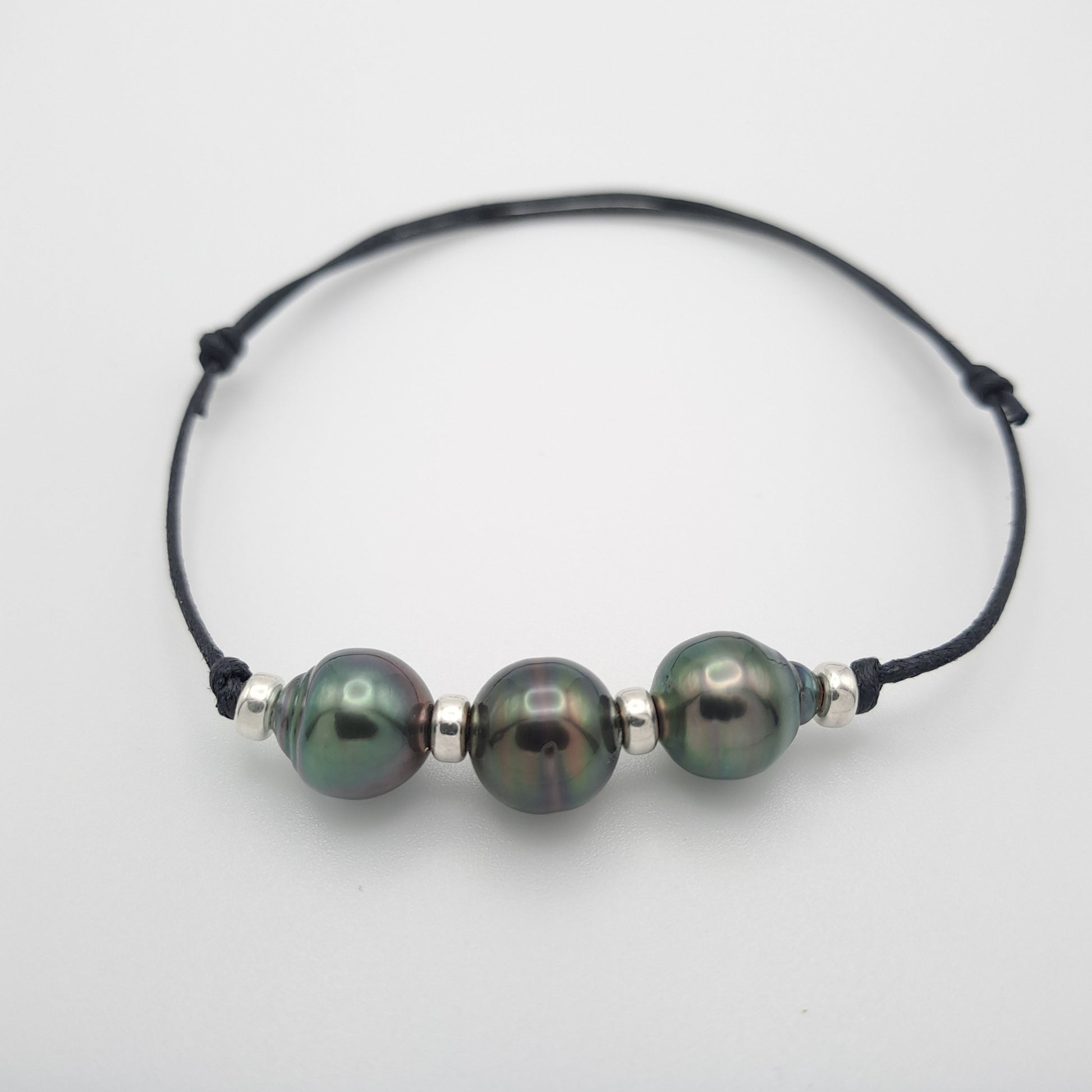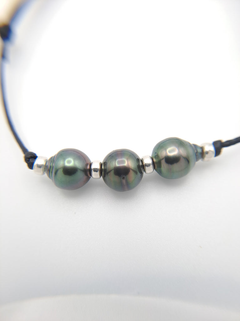 Un bijou authentique qui allie simplicité et élégance. Ce bracelet est composé de trois véritables perles de culture de Tahiti, montées sur un fil de coton ciré noir résistant. Chaque perle, avec ses reflets uniques allant du vert au violet foncé, incarne la beauté naturelle et mystérieuse du lagon polynésien.