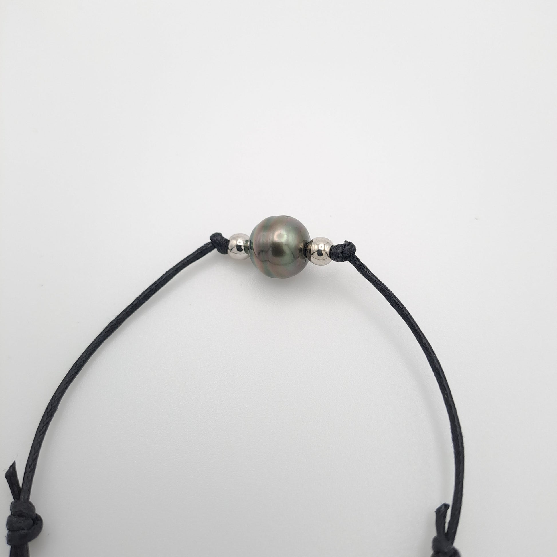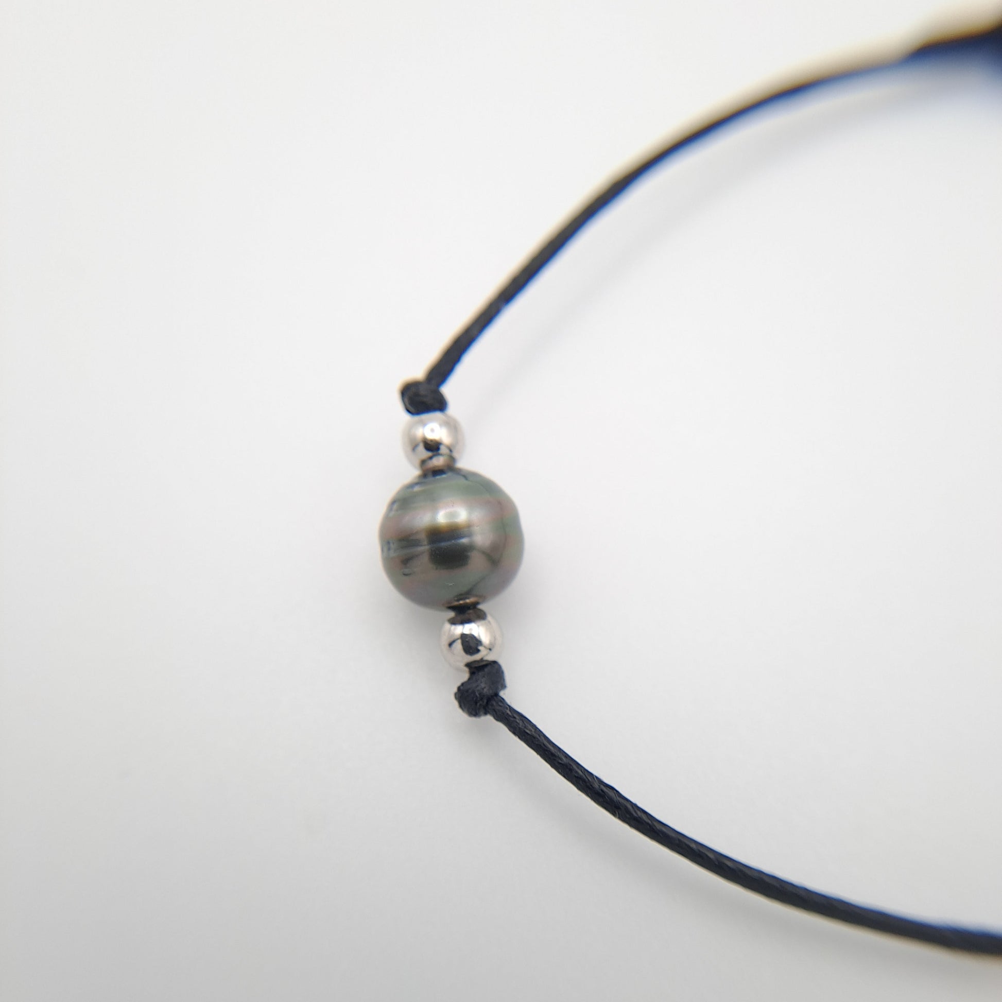 Un bracelet authentique qui allie simplicité et élégance. Ce bracelet est composé de 1 perle de culture de Tahiti cerclées, montées sur un fil de coton ciré noir résistant.