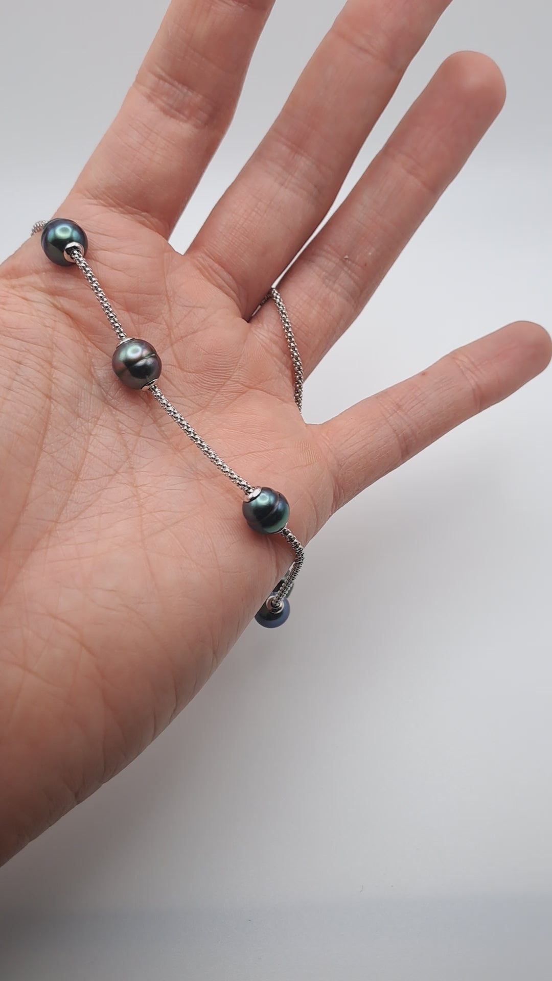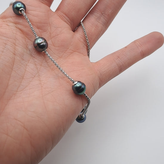 Ce collier en argent est composé de sept véritables perles de Tahiti, aux reflets profonds verts, gris et aubergine. Chaque perle est amovible, permettant de personnaliser le bijou selon l’envie : composition symétrique, minimaliste ou plus audacieuse.