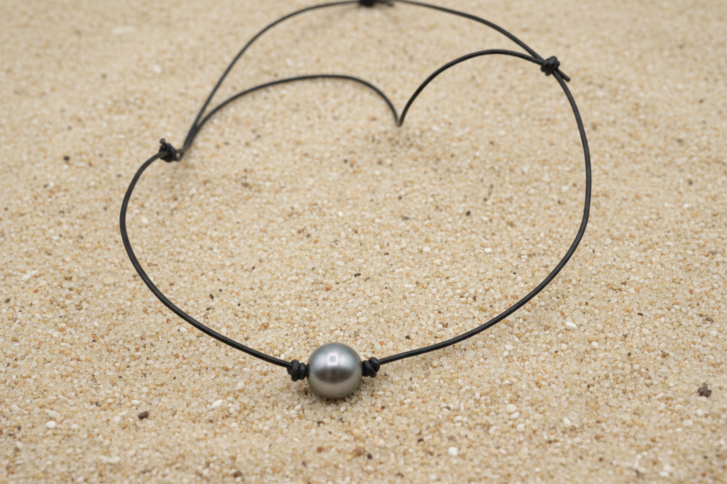 Collier en Cuir et Perle de Tahiti Cerclée